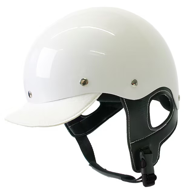 Stilig travhjälm med skärm och remmar i konstläder. Fästes under hakan med easy-click knäppning.